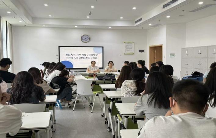 参访的最后一站,师生们来到长沙市儿童福利院。该院是一所斥资3.8亿元打造的现代化儿童福利机构。考虑到服务对象的隐私保护,社工部谭飘部长趁着儿童午休的间隙,先带领师生参观了社会工作服务场地、特殊教育学校和康复训练馆。在这些场馆中,儿童友好元素随处可见,设施之完备、功能之齐全、环境之优美,引得师生们连连赞叹。参观过后,双方在小组活动室进行了座谈,刘妮娜副院长全面介绍了该院儿童养护、特殊教育、康复训练、医疗救治和社会工作“五位一体”的服务体系,并以“爱佑新生”低龄重度脑瘫儿童照护、类家庭教养等创新服务项目为案例,生动示范了如何将社会工作专业理念、价值和手法运用于儿童服务,同学们获益匪浅。