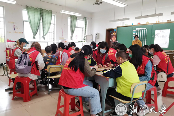 迎着清风,踏着暖阳,10余名志愿者带着手工制作的游戏道具和礼物启程前往湘潭市特殊教育学校。在特殊教育学校老师的带领下,志愿者们参观了校园,近距离地了解孩子们的学习生活环境。