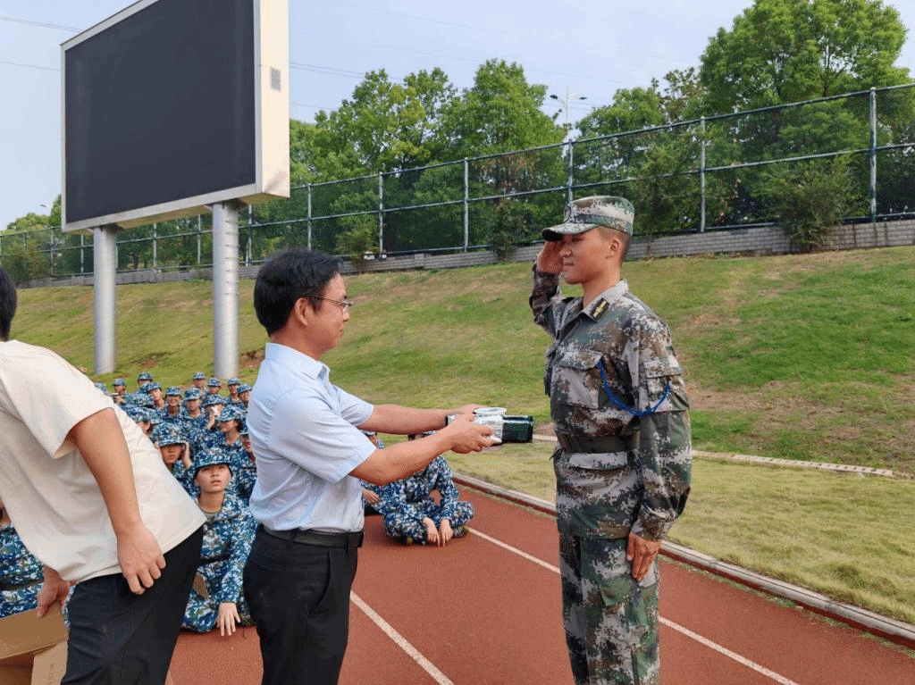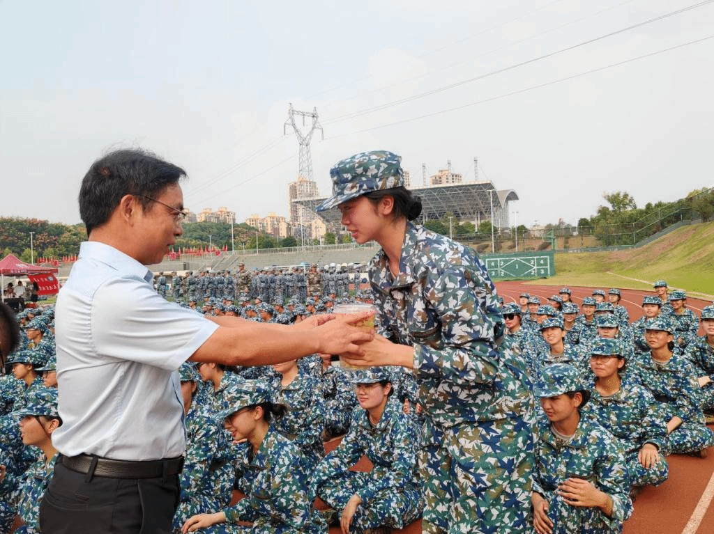 除了饮品和小食,院领导还向新生们传达了安全注意事项,提醒大家在训练期间注意补水,合理安排作息,确保身体健康。各班级的班主任和班主任助理也积极参与活动,与新生们互动,营造了和谐的军训氛围。