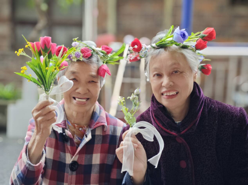 活动中,志愿者带领老人开展花艺实践,通过编花环、插花等环节讲解花卉文化内涵,并协助老人制作花艺作品。在“春韵摄心眸”环节为佩戴花环、手持花束的老人拍摄纪念照片,记录温馨瞬间。在“雷锋故事我感悟”分享会上,老人结合亲身经历讲述对雷锋精神的理解,志愿者通过方言交流拉近情感距离。活动还设置象棋对弈、经典红歌传唱等环节,展现代际文化互动。
